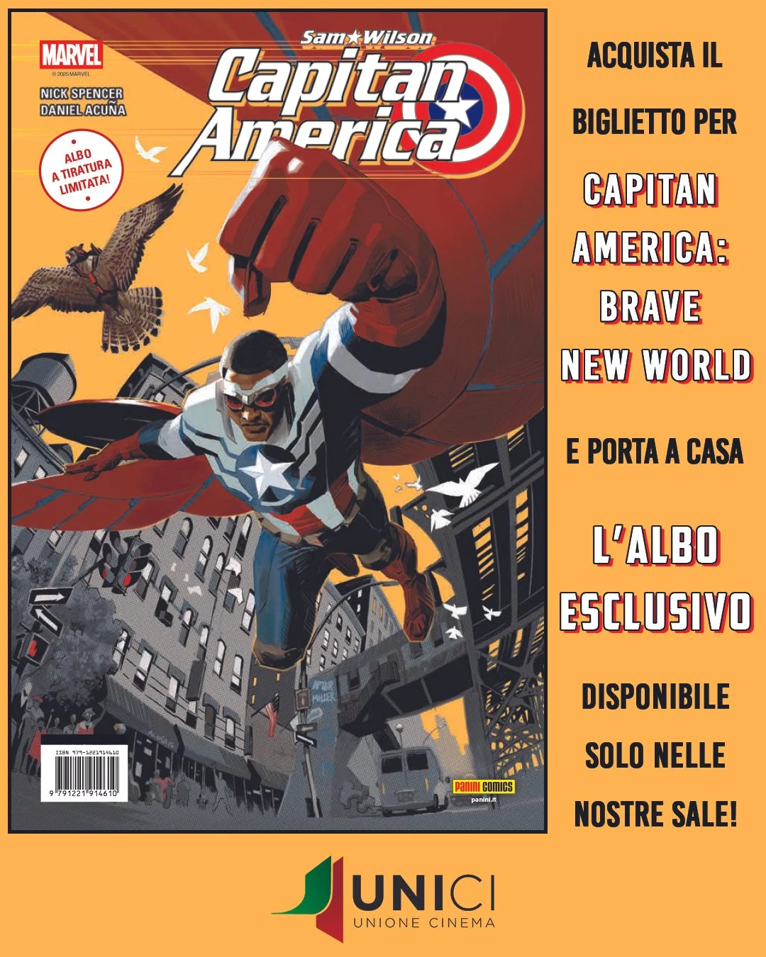 In occasione dell'uscita del nuovo capitolo della Marvel: "Capitan America: Brave New World", solamente nei cinema Unici potevi ricevere un albo esclusivo a tiratura limitata della Marvel (fino ad esaurimento scorte)! L'attività è stata promossa attraverso i canali social delle strutture coinvolte.