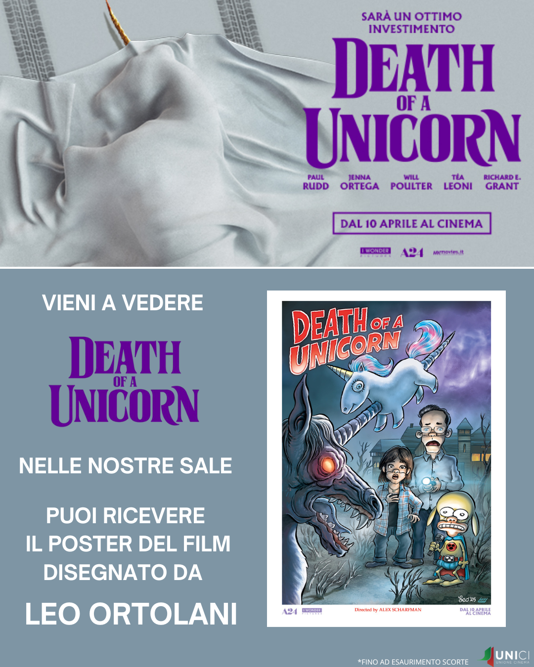 A partire dal primo giorno di programmazione del film “Death of Unicorn”, in sale Unici selezionate potevi ricevere lo sticker del film e un artwork disegnato da Leo Ortolani (fino ad esaurimento scorte). La promozione dell’attività è stata svolta sui canali social delle strutture coinvolte.